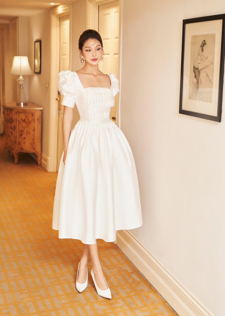 Đây là một kiểu váy mang đậm phong cách cổ điển và sang trọng. Đặc trưng của váy này là chiếc váy được cắt xoè, bồng bềnh và được thiết kế với cổ vuông, tạo nên một vẻ đẹp thanh lịch, quyến rũ và hiện đại. Thường được làm từ chất liệu như taffeta, satin hoặc lụa, mang lại vẻ mềm mại, nhẹ nhàng và nữ tính cho người mặc.