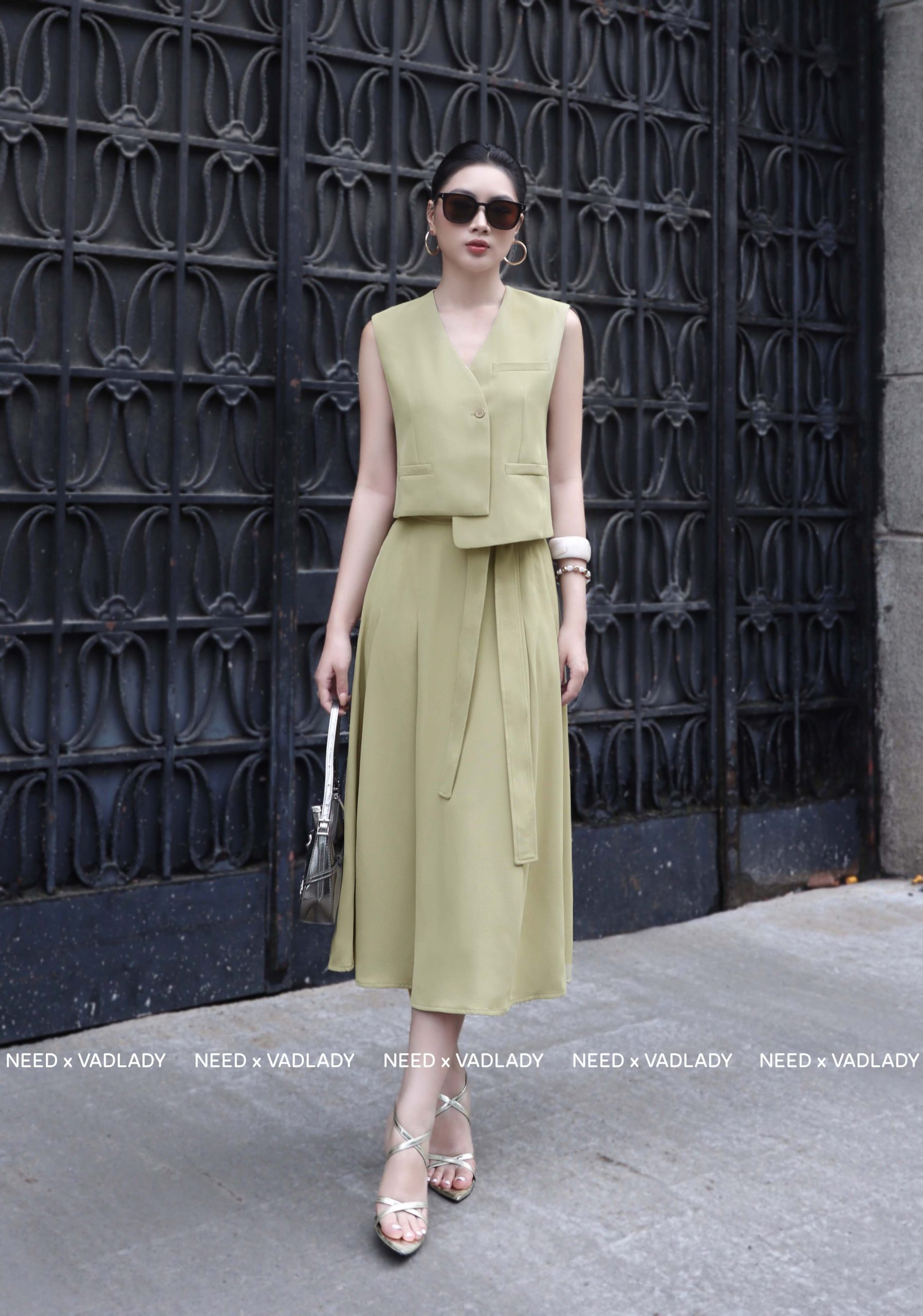 Set Áo Vest Ghi Lê và Chân Váy Xòe Xanh Rêu – VADLADY